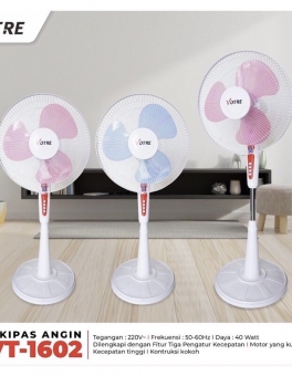 Rp 350.000 Rp 355.000Spesifikasi: -Ukuran Diameter kipas 16inch -Tombol Tiga pengatur kecepatan -Mesin Motor yang kuat dan tangguh – Putaran Dengan Kecepatan tinggi – menggunakan Konstruki yang kokoh – No Model VT-1602 – Tegangan Daya 220 V – Frekuensi 50-60Hz